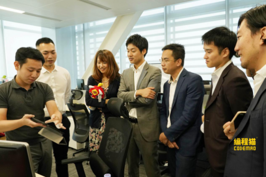 近日,在中日经贸合作日益紧密的发展态势下,日本经济产业省商务服务局参事官室政策规划委员Tsuwaki Yoshiko 、日本经济产业省商务服务局商务监督课课长助理Kitamura Takashi、日本经济产业省商务服务局参事官室课长助理Yamawaki Shota、日本驻广州总领事馆商务领事 Ishizawa Yoshiharu一同来到编程猫(深圳点猫科技有限公司)总部进行访问,双方就当前少儿编程教育发展进行了深入的交谈。编程猫联合创始人兼CTO孙悦亲自欢迎来宾并陪同参观,他说,当前少儿编程教育市场正逐步发展壮大,希望与更多的人共同探讨编程教育的未来。